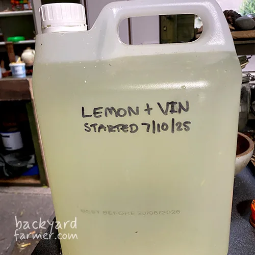 Add the lemon zest and pith to the 5 L bottle of white vinegar for cleaning. Seal it tightly and store it in a cool, dark cupboard for 3–4 weeks. Give the bottle a shake every few days to help release the natural citrus oils and deepen the scent.