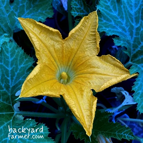 You’ll get big leaves first, then flowers. Once a female flower gets pollinated, the fruit grows fast—sometimes quicker than you expect.