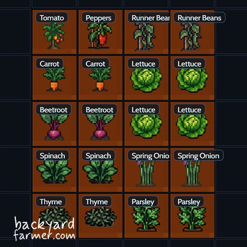 - Fruit crops: 2 squares of peppers or bush tomatoes