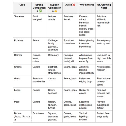 In practical vegetable companion planting UK terms, that usually involves: