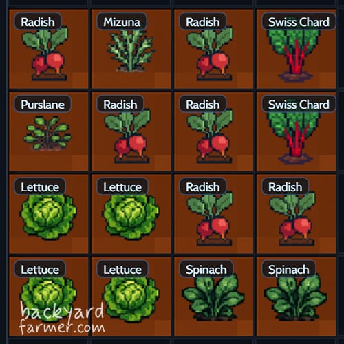 Radishes mature fast, making space for salad leaves, which can then be followed by spring onions. - Spinach → Beetroot